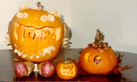 The Halloween weather was a bit tough on the pumpkins, but the pumpkinteers basked in the lingering Indian summer heat wave. Not as many jack-o-lanterns in the Harbor Store patch this year due to the early departure of several snowbird carvers. However, the sight and smell of the patch of creatively carved, candle lit pumpkins was pleasing to the many passersby. The Boorman sisters Liz and little Annie, with the help of the Boorman's adopted sister Sue, and Liz's Pocatello, ID co-worker Lou (a member of a BIG Idaho spud farmer family), took the "Great Pumpkin" award with their coordinated display of "Ida Pumptater" (complete with two of the famous Idaho spuds), "Ima Acron" and "Meow - Ida's and Ima's cat." Anne Boggio is our "Flasher" award winner for her sparkling "Christmas Tree" pumpkin. And a big "THANK YOU" to our Pumpkin Fest hostess Patti Crampton. She prepared the patch, kept the candles burning, and maintained a loving watch over the pumpkins as they brightened our hearts during their four day visit.