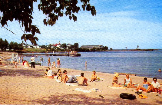 The fully clothed person in the post card is me, Jim Beyers. I practically never wore a bathing suit, and the one time I did, I got pushed off the dock and had to be rescued by some one who keeps reminding me of the event.(P>