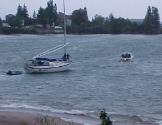 Last evening produced a crises - Peregrine, my sailboat, tossed about by a sudden 30 knot northeaster and the resulting angry lake swells rolling unmolested into the Harbor's west bay, dragged her big anchor and 100 feet of heavy chain rode and headed for the Shoreline Beach. I rushed to the beach, launched the rubber dinghy and bounced through the breaking beach waves to her aid. Scrambling up her tossing transom ladder, I could feel and hear the terrifying trump of her five-foot keel on the bottom. She was beginning to list, losing her stability. The roar of wind and waves breaking on the all too near beach was deafening. I started the engine, advanced the throttle, set her autopilot on an offshore course, and crawled forward along the deck to get her anchor up. The only hope was to power through the sand bottom and breaking waves into deeper water.