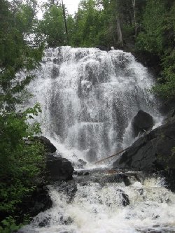 After treating myself to some french toast the next morning I sailed the short distance up to Otter Cove and anchored in the little bay just below the falls. Rowed the dingy up the creek through heavy current to the landing where the trail to the falls begins. What a surprise, the falls, which were totally dry when I stopped there last year, were still the raging torrent of water you found earlier this summer, so much so that I dared not venture into the cascading water. (No wonder the lake is up over a foot from last year.) I did slip into the warm pool just below the falls and basked in a Jacuzzi like bath. The resident eagle flew by to check me out - you would have loved it.