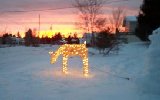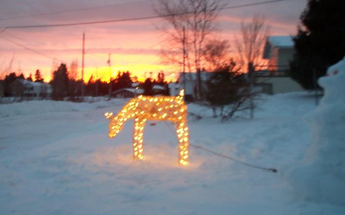 Outside, all is still – and magical. A light adorned small “nodding head” deer fixture, sent to me today by a daughter, shines brightly in the darkness, its dazzling light delighting the nearby Snow Bear and casting its bright radiance across the snow covered yard. My outdoor holiday tree, a twenty-foot pine just outside my window is loaded with colorful lights dancing a slow waltz in tonight’s gentle wind. Other lighted trees and beautifully decorated homes adorn the harbor shore, their happy countenance doubled as they reflect on the harbor waters. The yellow-orange phosphorus street lights, too often a bane in my life, tonight seem to have joined in the holiday spirit, giving shape and shadow to the fresh snow, and extending long flickering candle shaped reflections across the rippling harbor to my appreciative eye.
