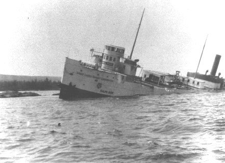 Our thanks to Bruce and Jeane Olson of Cat Harbor for these very rare photos of the steamer RALPH BUDD on the reef at Cat Harbor. Downbound from Duluth, the BUDD was caught in a northeast gale and blinding snowstorm on May 15, 1929 (yes, most years winter lasts into May), and crashed into the near shore reef about 10:30 that night. The wind was so fierce and the snow so thick that she was not discovered until 9:30 the following morning. Most of her crew made it ashore in the ship's lifeboats, the remainder were rescued by the Eagle Harbor Coast Guard crew. Many Eagle Harbor families tell stories of their parents and grandparents salvaging food products, especially butter, washed ashore from the ship's holds. The BUDD was pulled from the reef later that summer and after extensive repairs, returned to service.