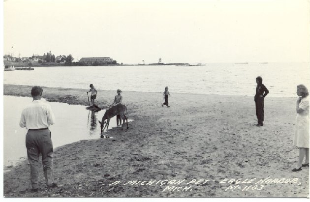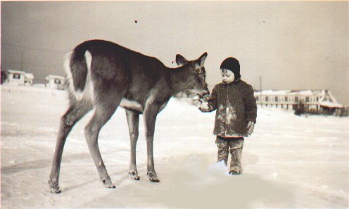 Eagle Harbor Tame Deer(click to enlarge.)In the late 1930s and 1940s, Harbor children of all ages were delighted as several deer decided mooching from the locals sure beat foraging in the forest. "Bambi" was the first and most popular with the kids, but she and her friends "Dewey" and "Rusty" were Harbor regulars.