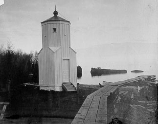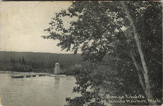 Eagle Harbor Range Lights(click to enlarge.)Rick and Elaine Finke found this rare photo of the Cedar Creek range lights at an Ebay auction. The lights were installed in 1877 at the time the harbor's entry channel was blasted through the reef. The photo is dated about 1910. The range light keeper lived in the rear structure. The original lamps were oil. In 1928 electricty arrived at the harbor and the keeper job was eliminated. The Light House Board subsequently sold the rear structure to Gertrude Rowe who had it moved to its present location on M-26 in the winter of 1932-1933. Dr. Bob Rowe, Gertrude's son, and his wife, Lucille, and their family now own the structure which they have carefully maintained and enjoy as a summer cottage. It's known as the "Tower and Lantern" cottage. (Does anyone know what happened to the front light structure?)